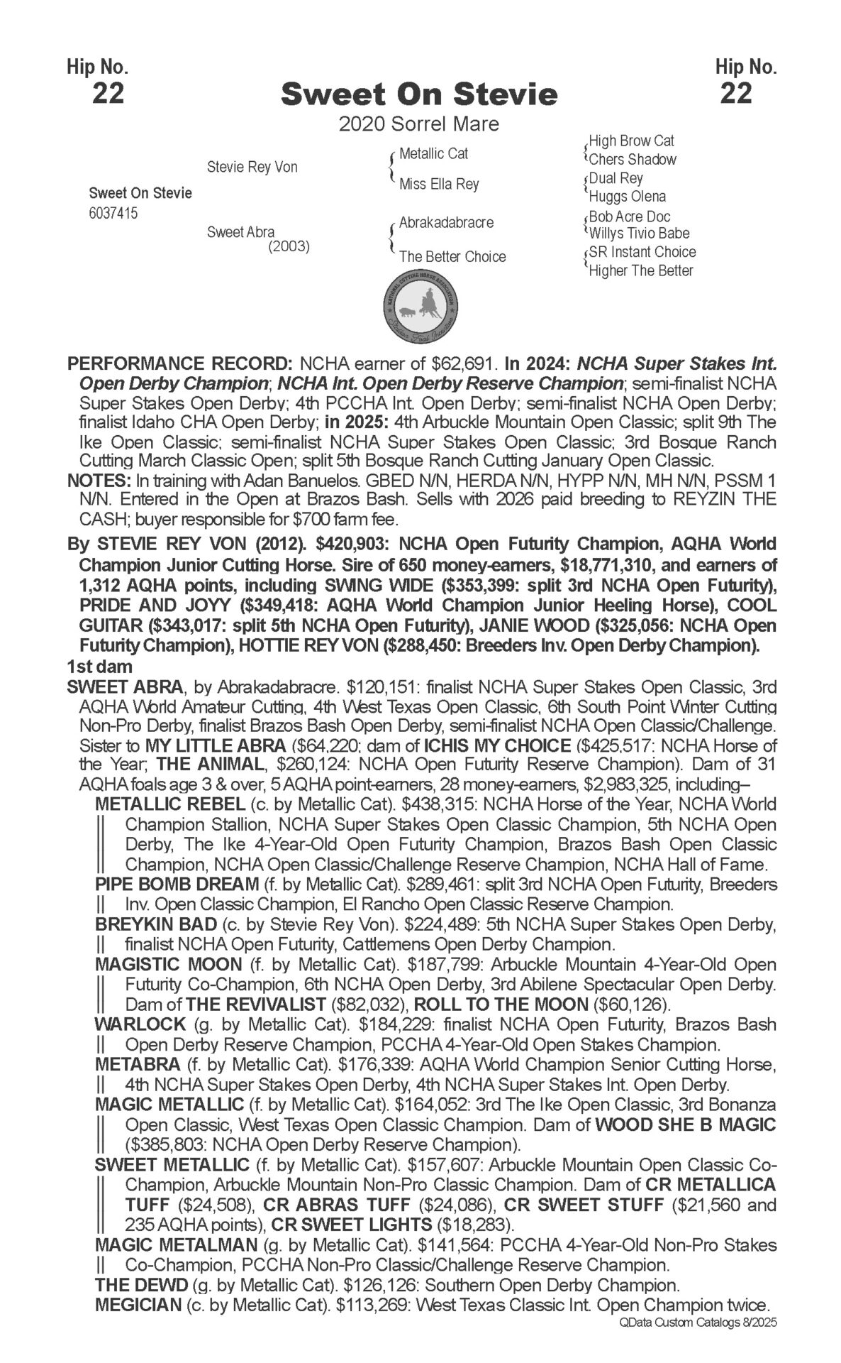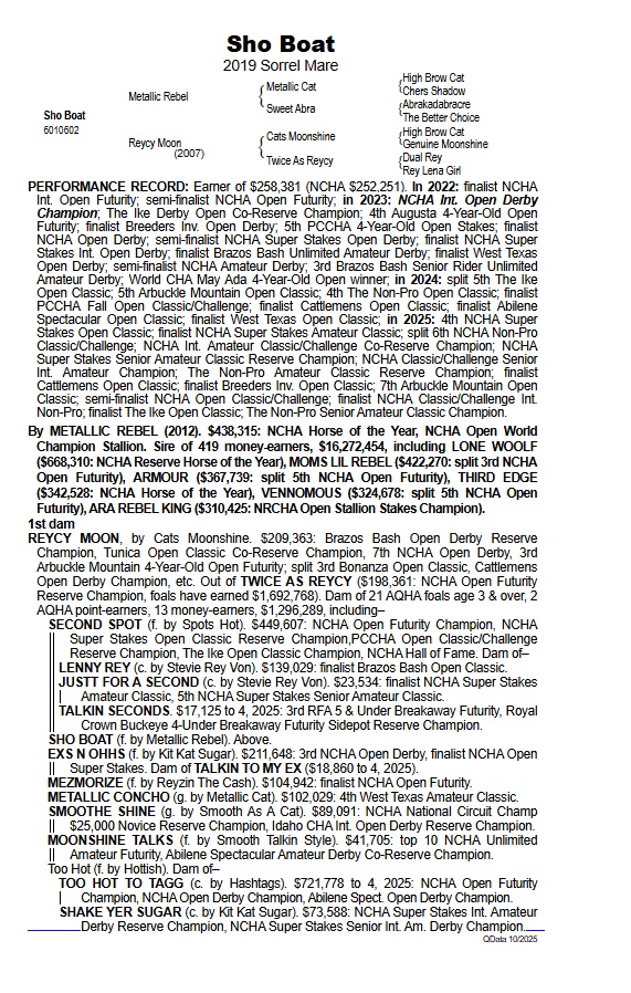 A beautiful own daughter of the amazing Peptoboonsmal. She has the classic Pepto look with her big jaws, withers, and freight train chest. Bonnie has had four foals and is currently bred to Metallic Cat. Bonnie has been in and out of the show pen in her life. She has won multiple shows in cutting and sorting work. She won a herd work event in Nevada scoring a 72 with a first-time youth rider.